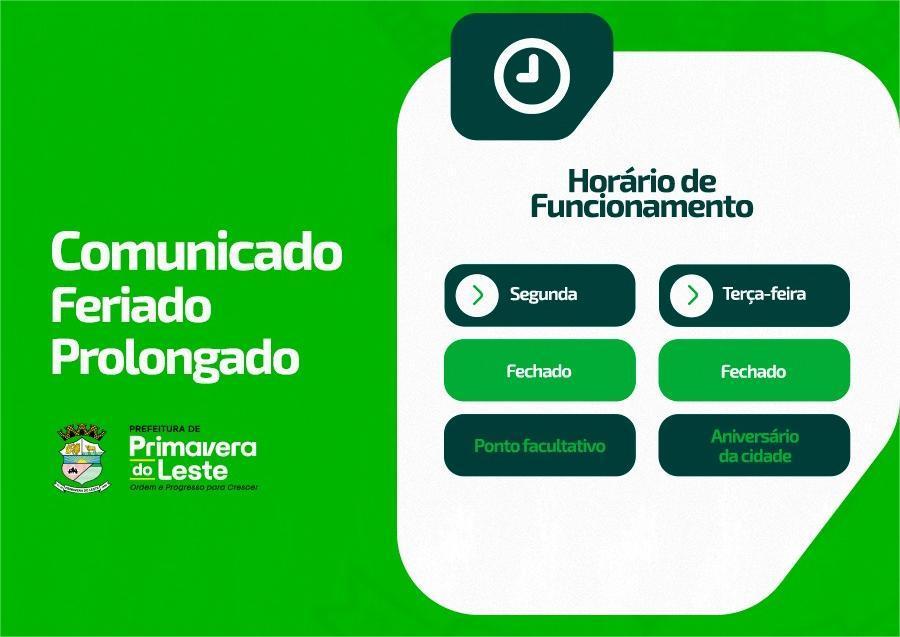 A Prefeitura Municipal e os demais órgãos públicos municipais de Primavera do Leste não funcionarão na próxima segunda e terça-feira (12 e 13), por conta da comemoração do aniversário da cidade. Na segunda-feira o ponto será facultativo e na terça-feira é o feriado de aniversário de 39 anos da cidade e somente os serviços públicos essenciais funcionarão.