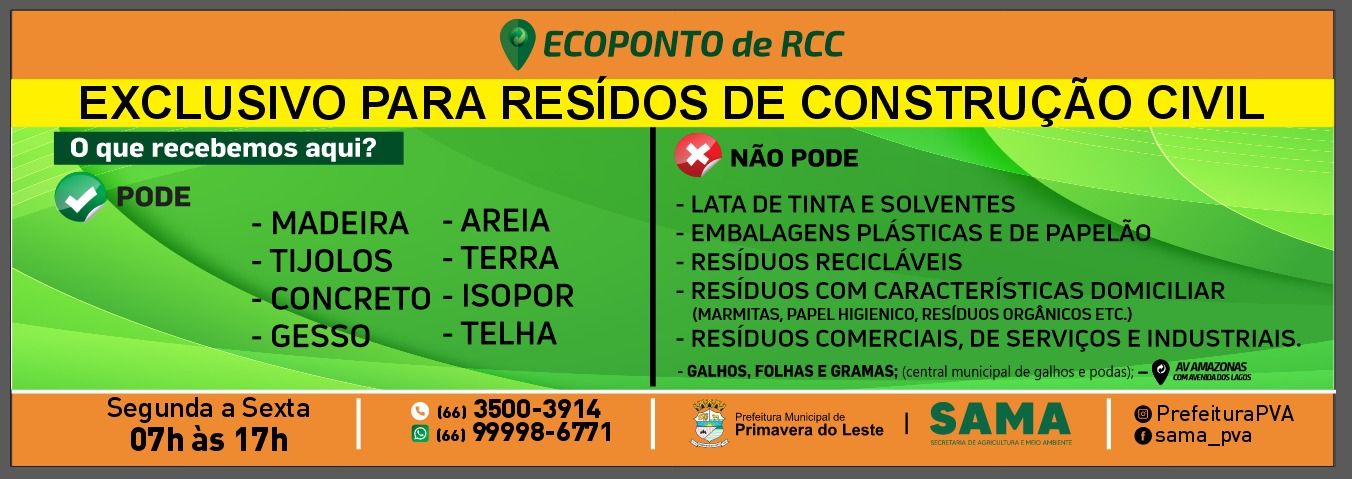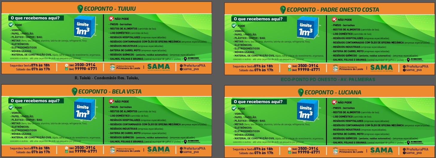 A Coordenação de Meio Ambiente da Secretaria Municipal de Agricultura e Meio Ambiente (Sama) de Primavera do Leste esclarece que há três tipos diferentes de Ecopontos e que cada um recebe um tipo específico de material
