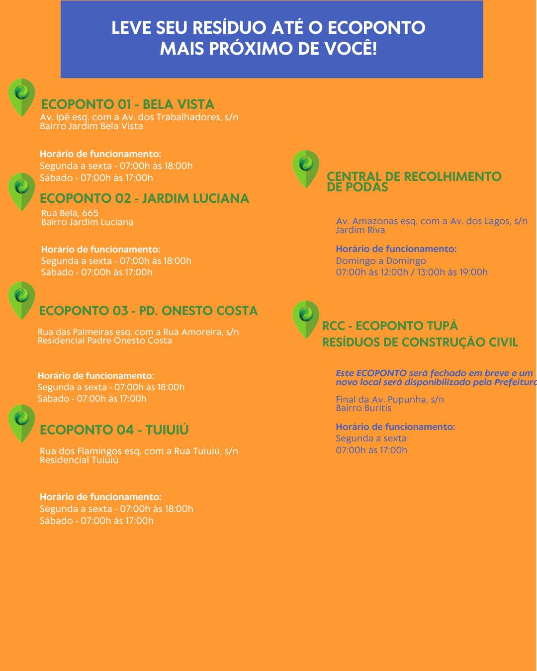 A cidade também conta com o Ecoponto destinado exclusivamente para os Resíduos da Construção Civil (RCC), que fica ao final da avenida Pupunha, no bairro Buritis, para onde podem ser destinados todos entulhos de construção civil acima de um método cúbico.