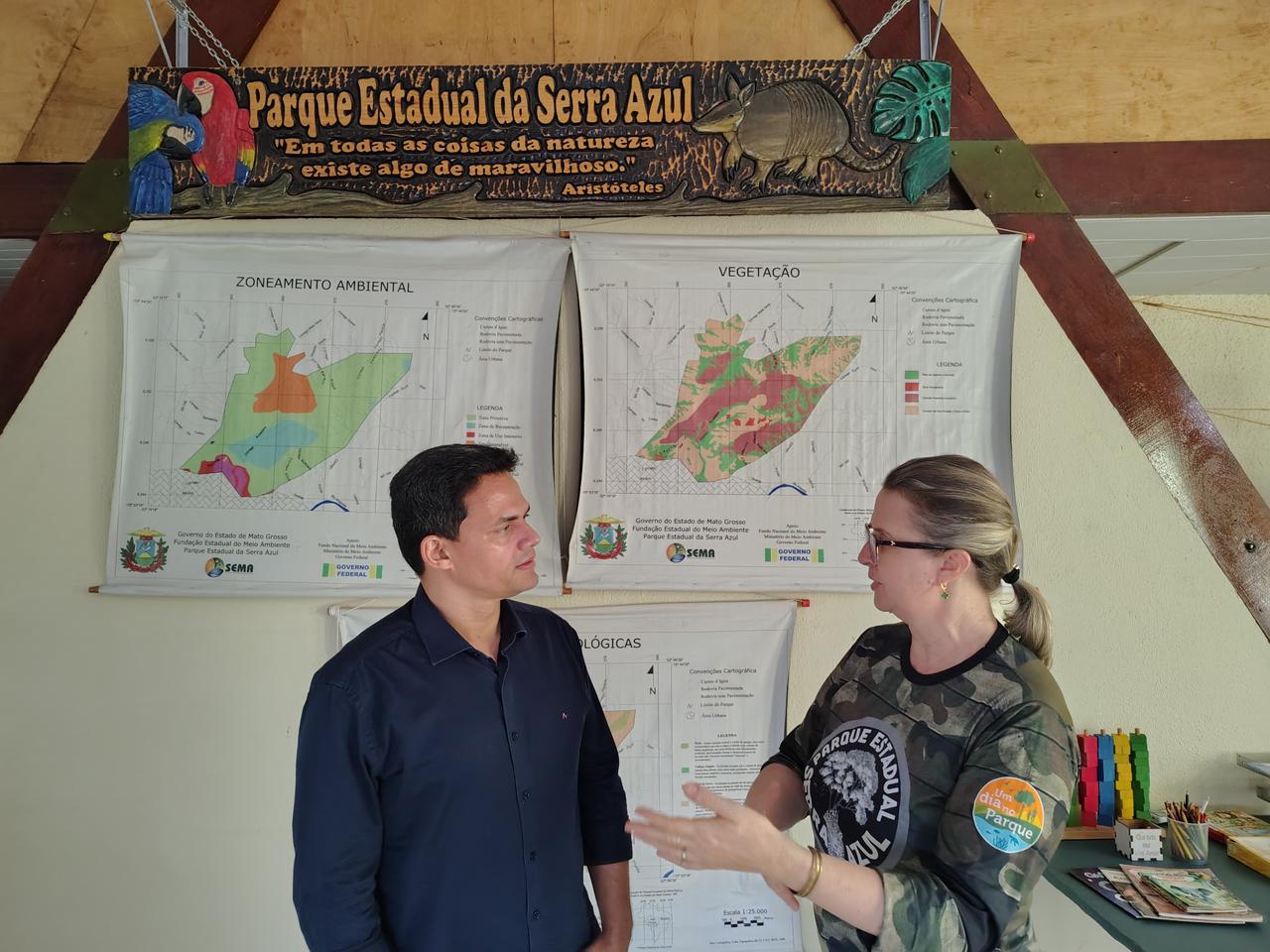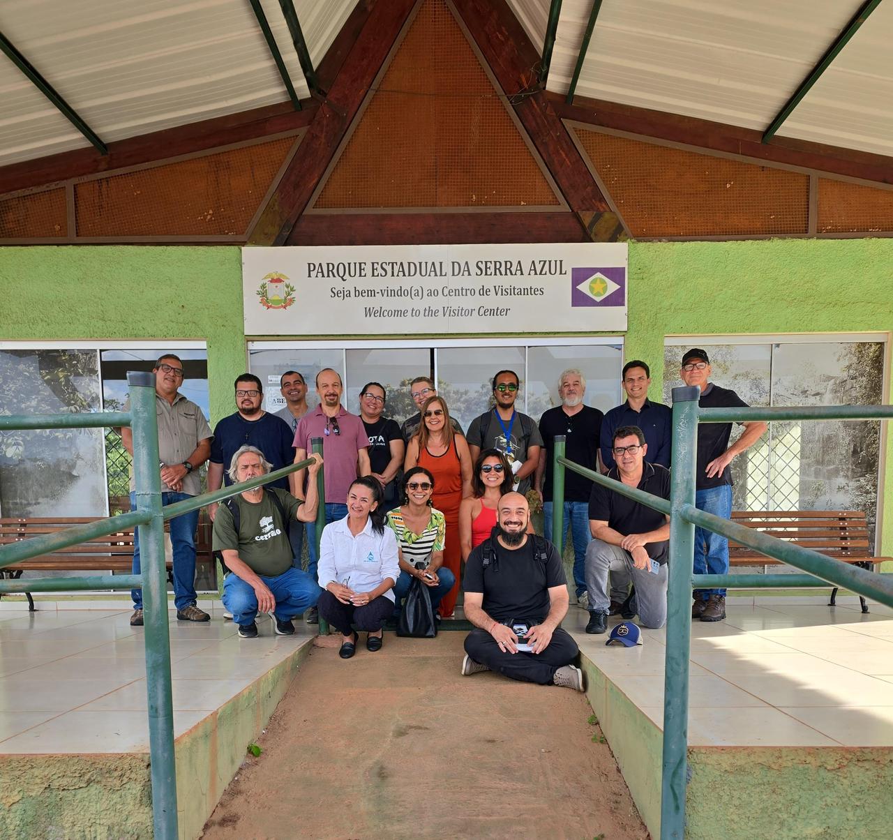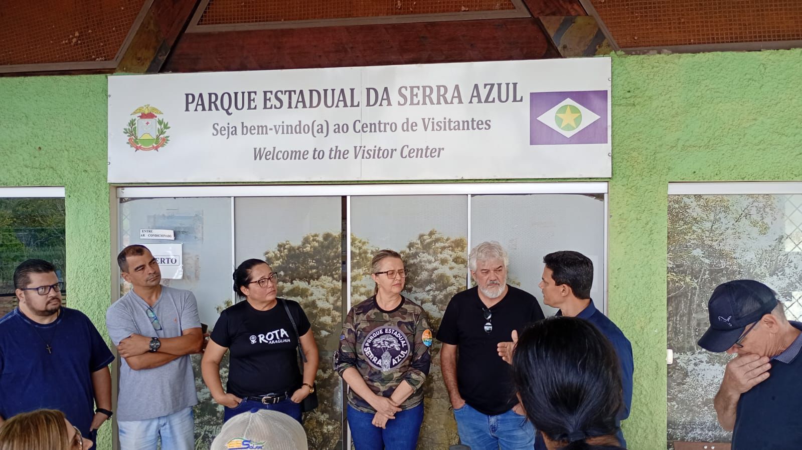 A comitiva foi recebida pela gerente regional do Parque Estadual Serra Azul, Sra. Cristiane Schnepfleitnel, que apresentou informações sobre o plano de combate a incêndios, processos administrativos, gestão após a criação do parque e demais etapas que envolvem a consolidação de uma unidade de conservação.