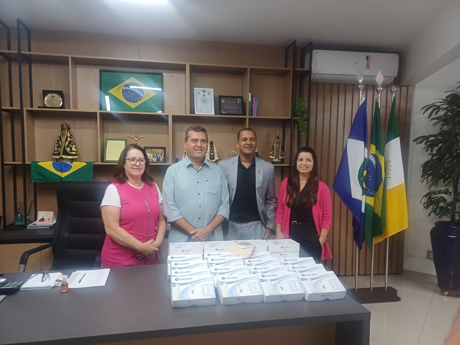 A Secretaria de Saúde de Primavera do Leste adquiriu dezenas de bolsas de colostomia para serem entregues a pacientes ostomizados, que a partir de agora poderão contar com o acessório fornecido pela rede pública municipal de Saúde. A entrega foi realizada pela secretária de Saúde, Laura Leandra ao prefeito Sérgio Machnic e à vice-prefeita Iva Viana, na sexta-feira, 11, em ato que contou com a presença do vereador Rafael Abreu, autor da Emenda Impositiva que possibilitou a aquisição.